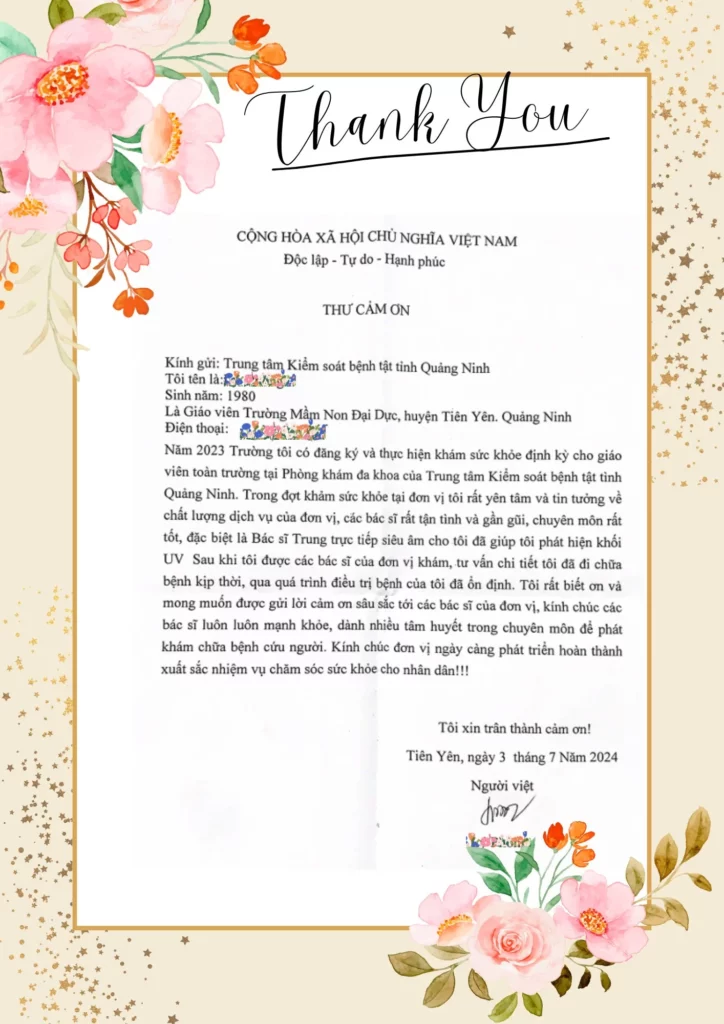 “Trong đợt khám sức khỏe tại đơn vị tôi rất yên tâm và tin tưởng về chất lượng dịch vụ của đơn vị, các bác sĩ rất tận tình và gần gũi, chuyên môn rất tốt… giúp tôi phát hiện khối u vú. Sau khi tôi được các bác sĩ của đơn vị khám, tư vấn chi tiết tôi đã đi chữa bệnh kịp thời, qua quá trình điều trị bệnh của tôi đã ổn định…”. Đây là những chia sẻ trong Thư cảm ơn của cô giáo L.P (sinh năm 1980, Tiên Yên, Quảng Ninh) gửi tới Trung tâm Kiểm soát bệnh tật Quảng Ninh sau khi chị được khám phát hiện u vú trong quá trình khám sức khỏe định kỳ cho giáo viên toàn trường tại Phòng khám Đa khoa của Trung tâm.
