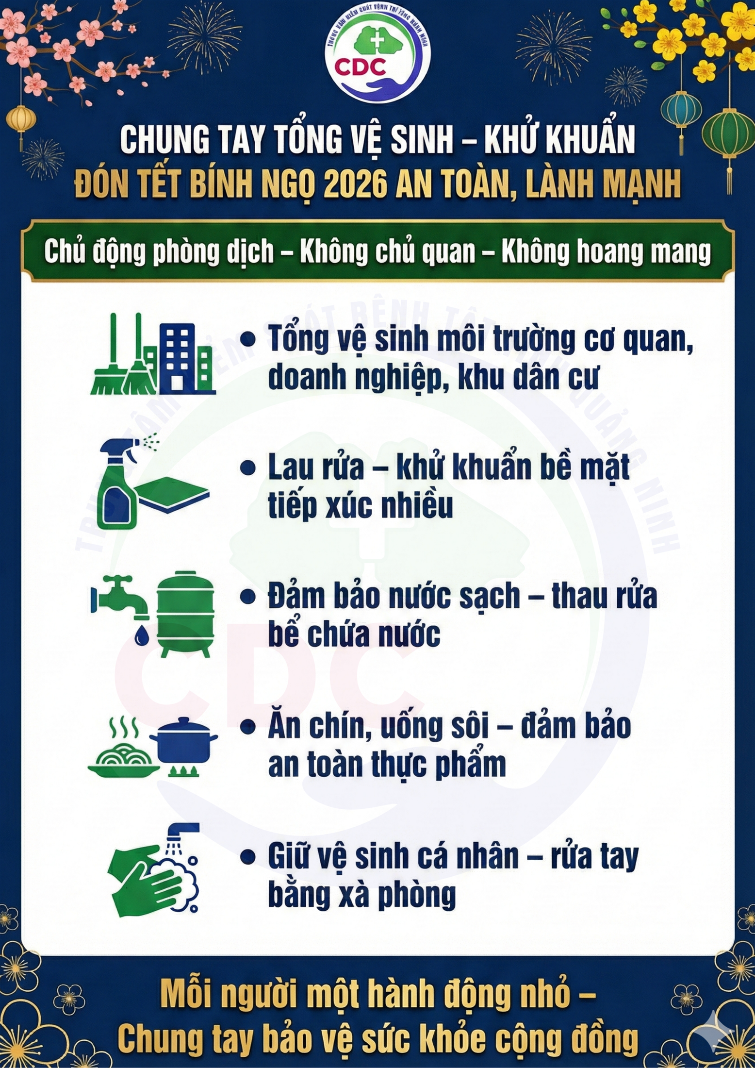 Với tinh thần “Chủ động phòng dịch – Không chủ quan – Không hoang mang”, CDC Quảng Ninh kêu gọi mỗi cơ quan, mỗi doanh nghiệp và mỗi người dân cùng chung tay giữ gìn vệ sinh môi trường, sử dụng nước sạch, ăn uống an toàn, bảo vệ sức khỏe cho bản thân, gia đình và cộng đồng – để đón Tết Bính Ngọ 2026 vui tươi, an lành, trọn vẹn.