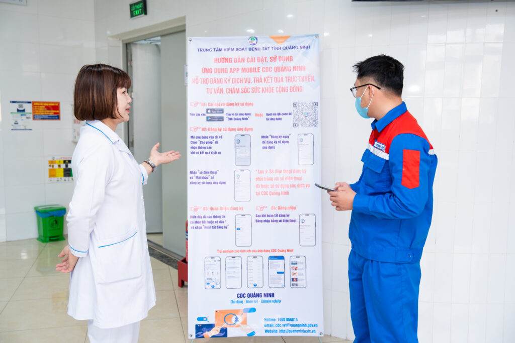 Người dân tới khám, chữa bệnh tại CDC Quảng Ninh được hướng dẫn sử dụng và cái đặt ứng dụng App CDCQN
