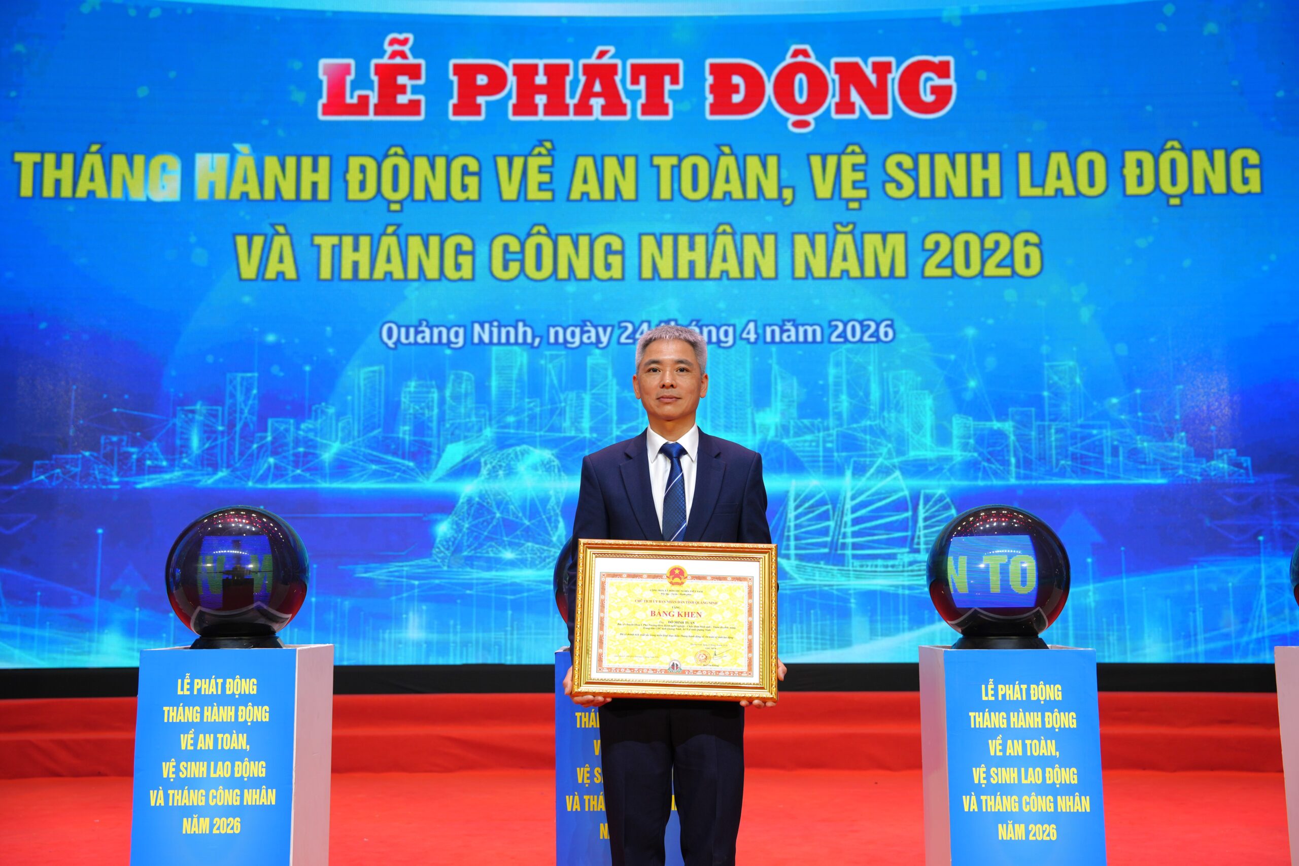 Tại buổi lễ, BSCKI. Đỗ Minh Tuấn – Phó Trưởng khoa Bệnh nghề nghiệp – Chẩn đoán hình ảnh – Thăm dò chức năng (CDC Quảng Ninh) đã vinh dự được trao tặng Bằng khen của Ủy ban nhân dân tỉnh Quảng Ninh trong triển khai thực hiện Tháng hành động về An toàn vệ sinh lao động. Đây là phần thưởng cao quý ghi nhận những nỗ lực bền bỉ và đóng góp chuyên môn sâu sắc của cá nhân đồng chí trong việc chăm sóc sức khỏe, phòng chống bệnh nghề nghiệp cho người lao động.