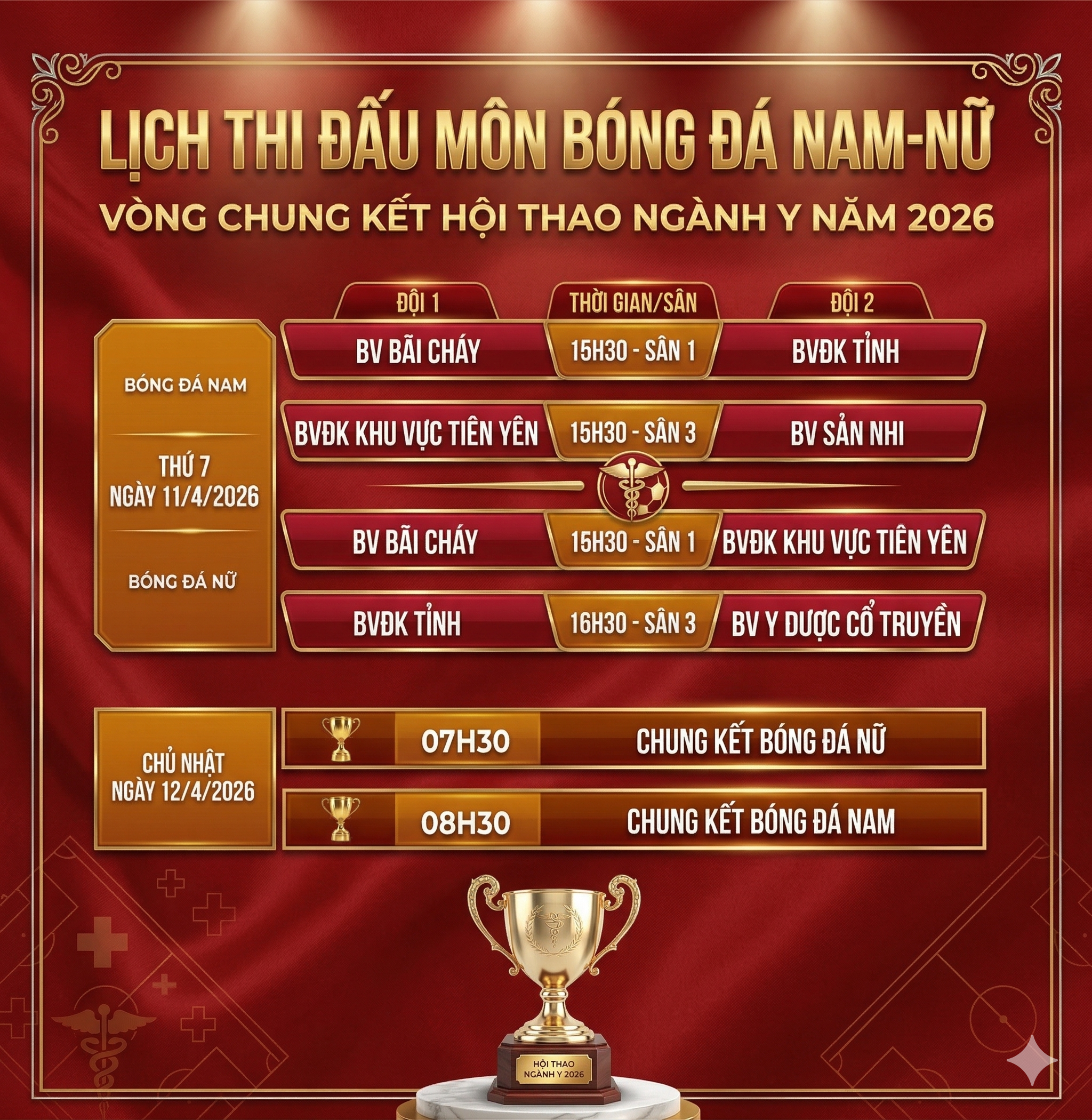 Hướng tới Hội thao ngành Y tế năm 2026, Ban Tổ chức đã chính thức công bố lịch thi đấu môn bóng đá nam – nữ vòng chung kết, đánh dấu thời điểm các đội bóng bước vào chặng tranh tài được mong chờ nhất.