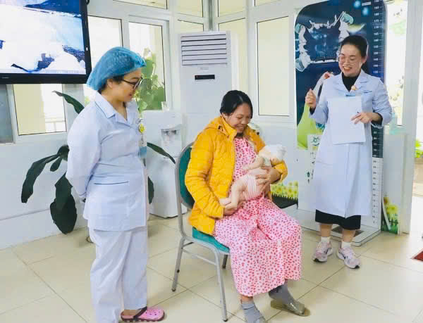 ThS.BSNT. Nguyễn Thị Trang, Phó khoa phụ trách Khoa Dinh dưỡng Tiết chế, Bệnh viện Sản Nhi Quảng Ninh hướng dẫn bà mẹ cho con bú đúng cách ( Ảnh: Bệnh viện Sản Nhi)
