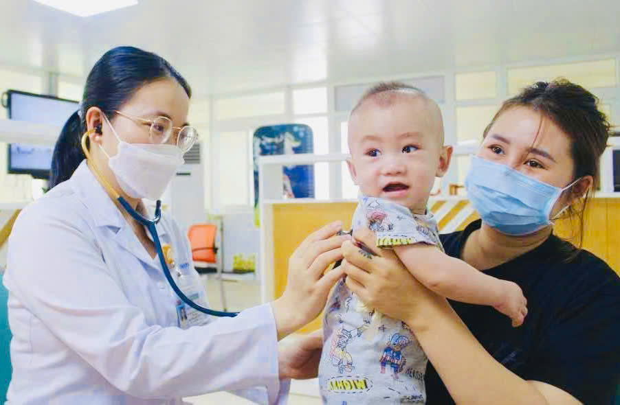 ThS.BSNT. Nguyễn Thị Trang, Phó khoa phụ trách Khoa Dinh dưỡng Tiết chế, Bệnh viện Sản Nhi Quảng Ninh khám cho trẻ tại bệnh viện ( Ảnh: Bệnh viện Sản Nhi)