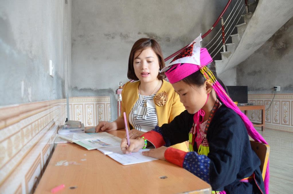 Cô giáo Ngô Thị Nguyện, Trường Tiểu học Nam Sơn (huyện Ba Chẽ) đến nhà giao bài tập cho học sinh trong giai đoạn nghỉ học do dịch Covid-19.