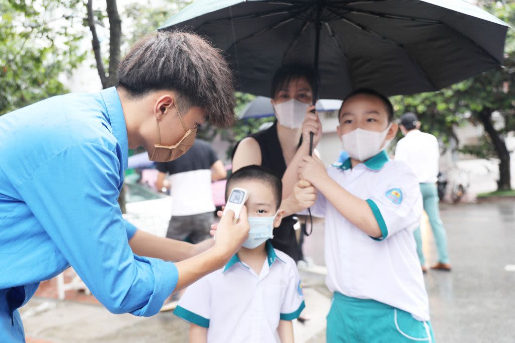 Trong ngày khai giảng năm học 2021-2022, học sinh cùng khách ra, vào Trường Tiểu học, THCS, THPT Văn Lang (TP Hạ Long) đều phải đeo khẩu trang, đo nhiệt độ và rửa tay sát khuẩn.