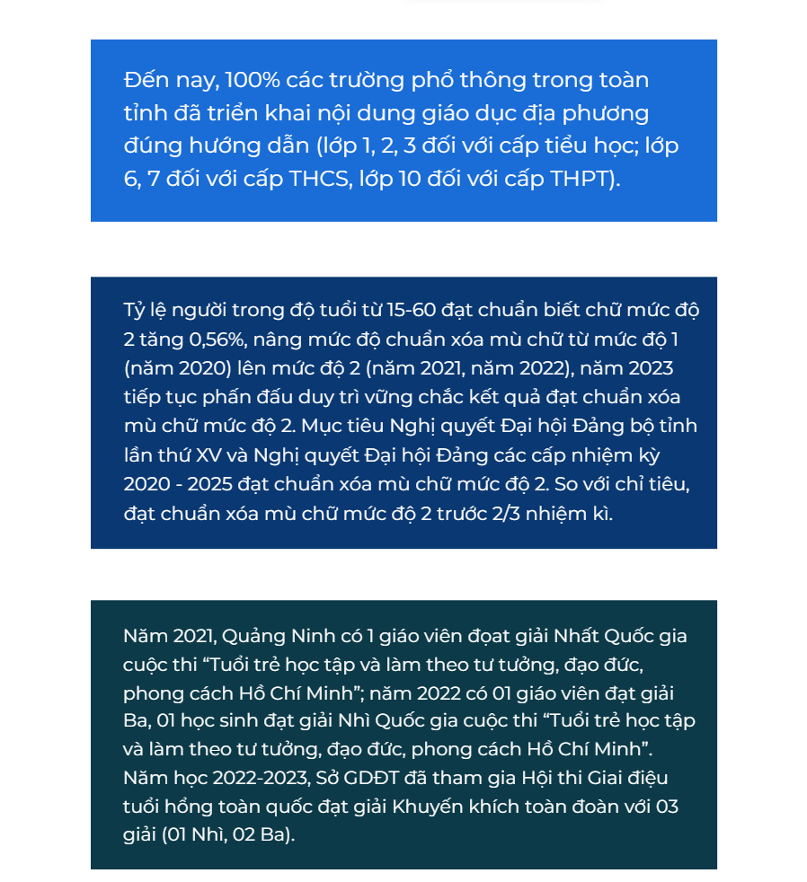Theo số liệu mới nhất của ngành Giáo dục tỉnh, sau 2,5 năm thực hiện Nghị quyết Đại hội XV của tỉnh, Quảng Ninh có 89,19% trường đạt chuẩn quốc gia cao hơn bình quân chung toàn quốc (49,1%). Ước tính đến hết năm 2023 đạt 90,14% (đạt chỉ tiêu trước nửa nhiệm kỳ so với mục tiêu đề ra là đến năm 2025 đạt 90%); tỷ lệ phòng học kiên cố hóa đạt 92,1% (tăng 2,1% so với đầu nhiệm kỳ).  Đội ngũ cán bộ quản lý, giáo viên, nhân viên trong toàn ngành được quan tâm chăm lo, bồi dưỡng, đào tạo đảm bảo phẩm chất, đạo đức và đến nay có trên 22.000 người đang đảm nhiệm nhiệm vụ giảng dạy, chăm sóc cho gần 400.000 trẻ em, học sinh, sinh viên, trong đó trên 90% giáo viên ở các cấp học đạt trình độ chuẩn và trên chuẩn.