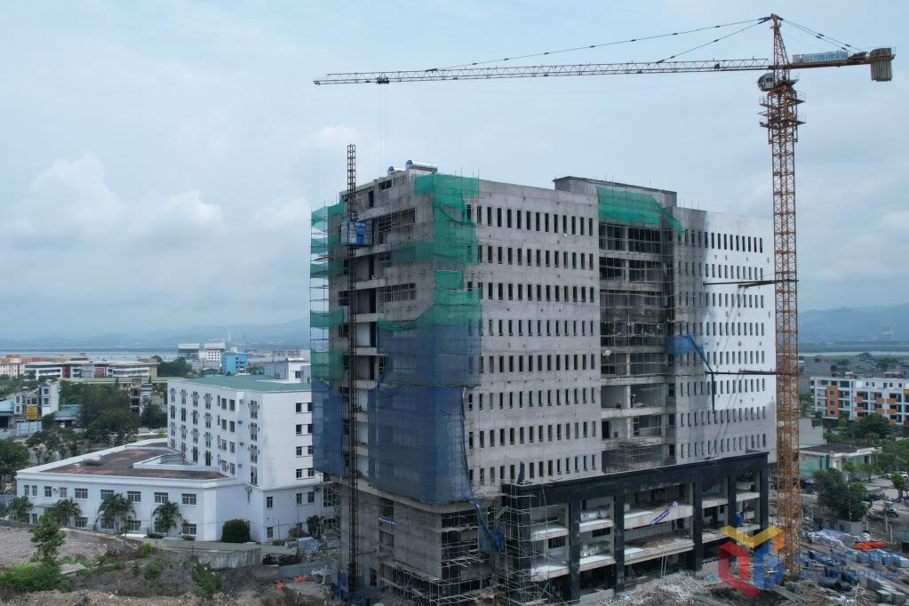 Khối nhà kỹ thuật, nghiệp vụ, điều trị, dinh dưỡng 11 tầng thuộc Dự án đầu tư nâng cấp, mở rộng Bệnh viện Phổi tỉnh hiện đang bước vào giai đoạn hoàn thiện. Ảnh: Đỗ Phương