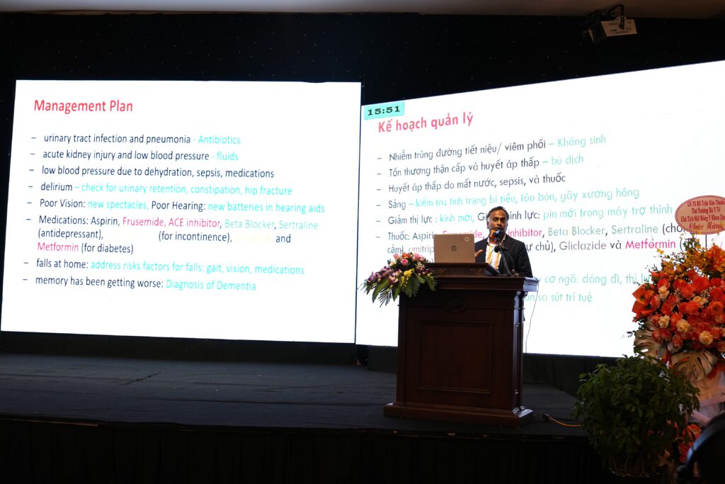 Hội nghị năm nay ghi nhận hơn 100 báo cáo khoa học với các chuyên đề chuyên sâu về sa sút trí tuệ, hội chứng dễ bị tổn thương, bệnh lý tim mạch – thận – chuyển hóa, vai trò của vaccine dự phòng và mô hình chăm sóc người cao tuổi thích ứng với bối cảnh mới. Đặc biệt, nghiên cứu hợp tác Việt – Pháp (NUTRIMPACT) về tỷ lệ và yếu tố liên quan đến sarcopenia (mất khối cơ ở người cao tuổi) được đánh giá là một trong những điểm nhấn của hội nghị. Các báo cáo từ Nhật Bản, Úc và Đức cũng đem đến nhiều cập nhật về chẩn đoán hình ảnh, điều trị sa sút trí tuệ, bệnh Parkinson và các tiến bộ trong tiêm chủng thế hệ mới.
