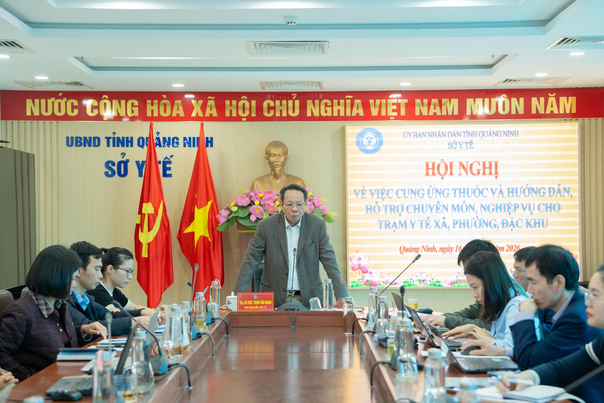 Sáng 16/1, Sở Y tế Quảng Ninh tổ chức hội nghị trực tuyến về công tác cung ứng thuốc và hướng dẫn, hỗ trợ chuyên môn, nghiệp vụ cho các Trạm y tế xã, phường, đặc khu trên địa bàn tỉnh. Hội nghị do đồng chí Trịnh Văn Mạnh, Phó Giám đốc Sở Y tế, chủ trì, với sự tham dự của lãnh đạo, chuyên viên các phòng Kế hoạch – Tài chính, Nghiệp vụ Dược, Nghiệp vụ Y; đại diện Phòng Bảo trợ xã hội, Trung tâm Kiểm nghiệm, Bảo hiểm xã hội tỉnh cùng lãnh đạo, cán bộ phụ trách công tác dược tại các điểm cầu địa trên địa bàn Tỉnh.