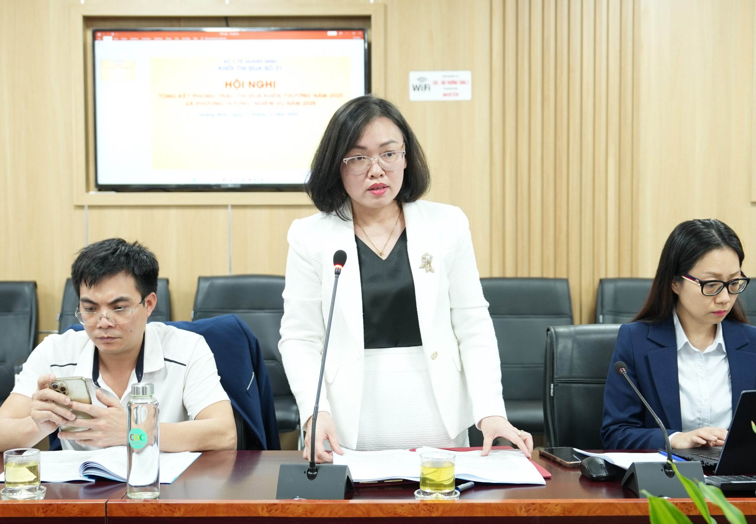 Đồng chí Phạm Thị Khánh Hiền – Thư ký Khối thi đua số 21 trình bày báo cáo tại hội nghị
