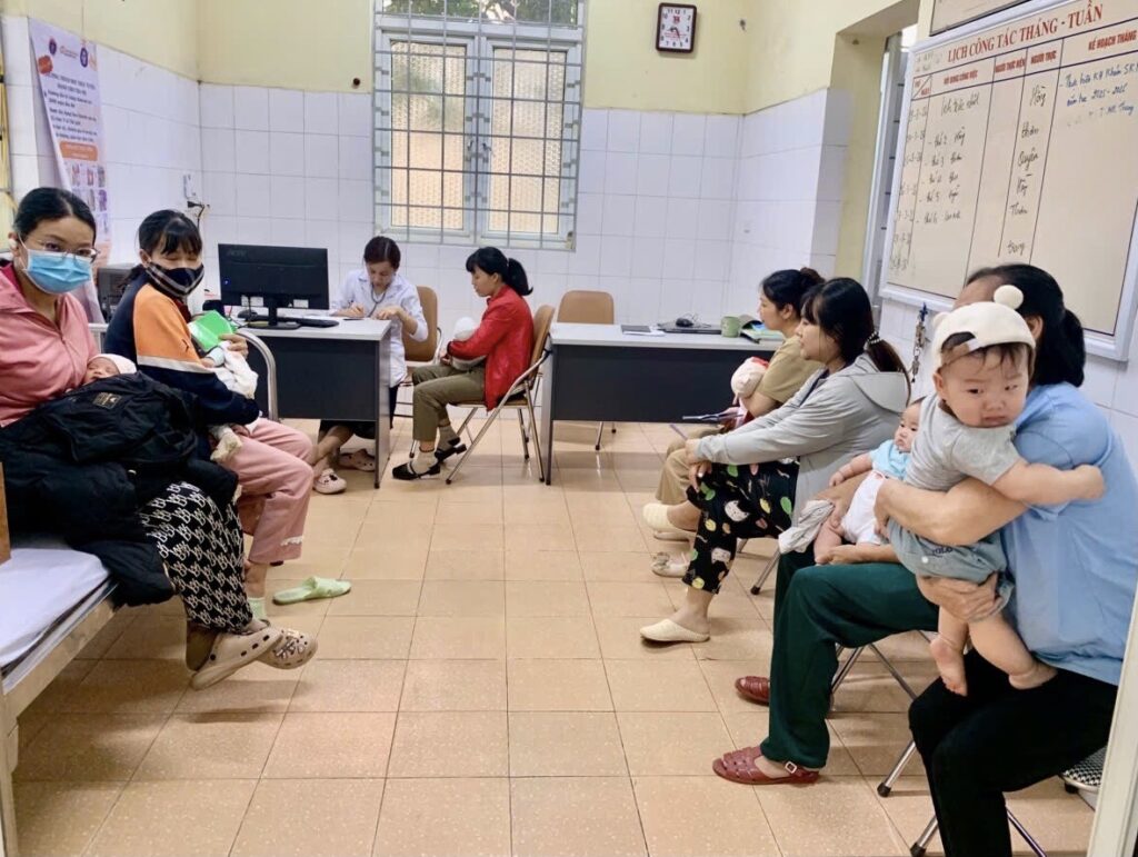 Phụ huynh đưa con đi tiêm chủng định kỳ tại Trạm Y tế phường Việt Hưng
