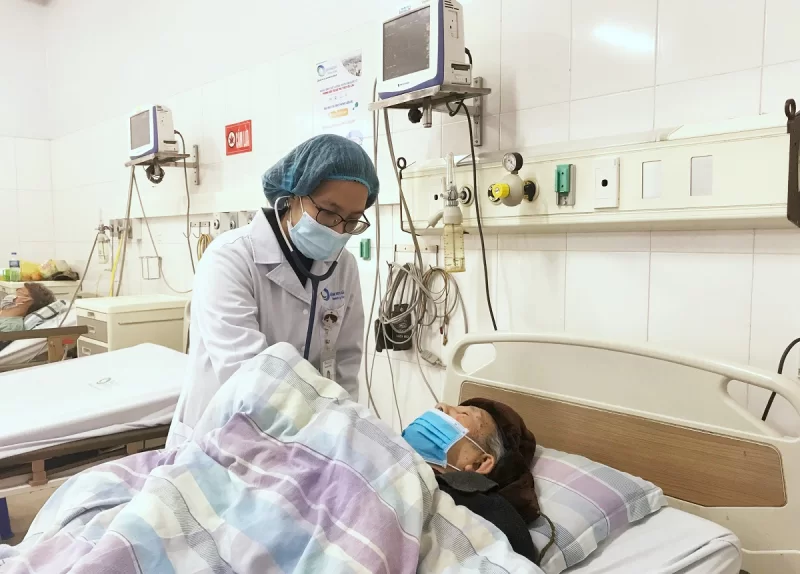 Bác sĩ CKI. Phạm Thị Út Trang – Khoa Nội Hô hấp, Bệnh viện Bãi Cháy thăm khám cho bệnh nhân hen phế quản cấp