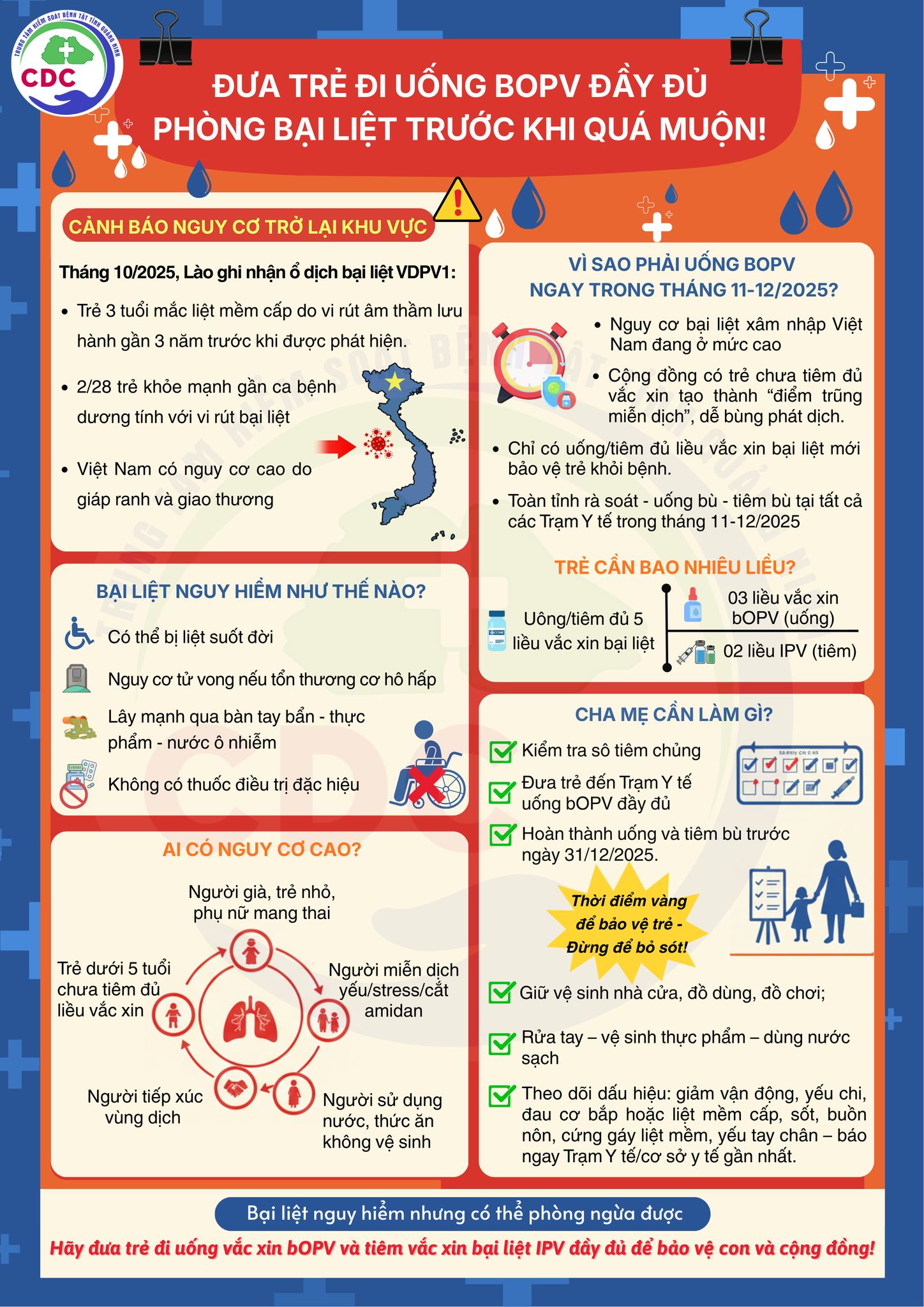 Tháng 10 năm 2025, Tổ chức Y tế Thế giới (WHO) thông báo tại Lào ghi nhận 01 trường hợp liệt mềm cấp và 02 trẻ khỏe mạnh tiếp xúc có kết quả dương tính với vi rút bại liệt týp 1 biến đổi gen có nguồn gốc từ vắc xin (VDPV1). Kết quả phân tích cho thấy vi rút đã âm thầm lưu hành và lây truyền trong cộng đồng trong thời gian dài trước khi được phát hiện, làm gia tăng nguy cơ bùng phát dịch nếu không có các biện pháp phòng, chống kịp thời và hiệu quả. Việt Nam có đường biên giới và hoạt động giao lưu, đi lại, lao động, học tập và khám chữa bệnh xuyên biên giới thường xuyên với Lào. Do đó, nước ta được đánh giá là có nguy cơ cao trước khả năng vi rút bại liệt xâm nhập và lây lan trở lại nếu tỷ lệ tiêm chủng phòng bệnh không được duy trì đầy đủ, đồng đều trong cộng đồng.