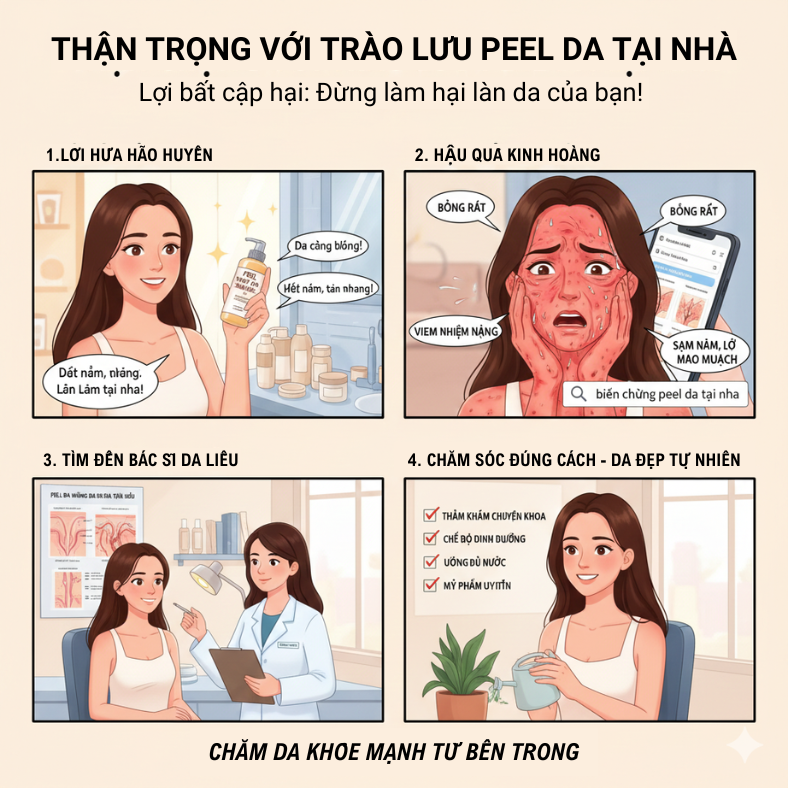 Vài năm trở lại đây, phương pháp peel da hay còn gọi là thay da sinh học đang được không ít người lựa chọn để điều trị những vấn đề như: nám sạm, sẹo mụn, thu nhỏ lỗ chân lông, dưỡng da mịn màng, tươi trẻ… Phương pháp này được nhiều người đánh giá rất hiệu quả và có thể tự thực hiện được tại nhà. Tuy nhiên cũng không ít trường hợp khi peel da gây biến chứng, hậu quả nghiêm trọng.