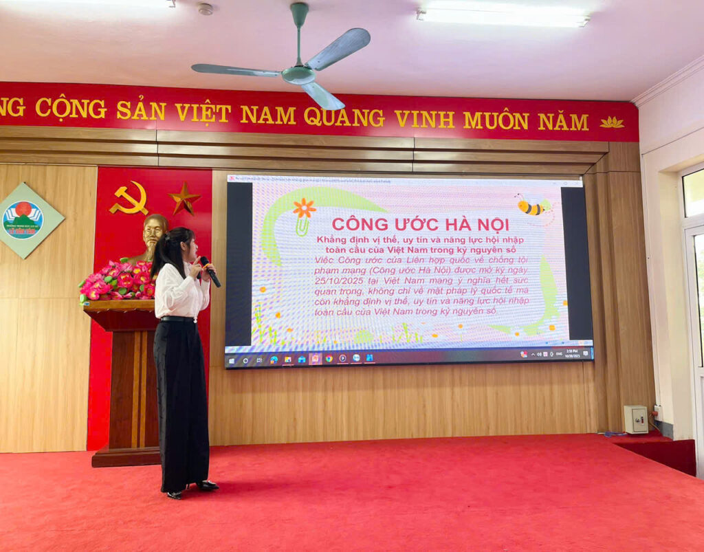 Điểm nhấn đặc biệt của chương trình là phần liên hệ giữa Công ước Hà Nội và việc giáo dục kỹ năng số trong nhà trường nhằm lan tỏa tinh thần của Công ước Hà Nội trong trường học. Báo cáo viên nhấn mạnh: việc Việt Nam đăng cai mở ký Công ước Hà Nội không chỉ thể hiện vai trò của đất nước trong hợp tác quốc tế, mà còn là lời khẳng định mạnh mẽ về cam kết bảo vệ trẻ em trên không gian mạng. Mỗi học sinh cần trở thành “người dùng thông minh”, biết tự bảo vệ bản thân, tôn trọng quyền riêng tư của người khác và lan tỏa giá trị tích cực khi tham gia môi trường trực tuyến.