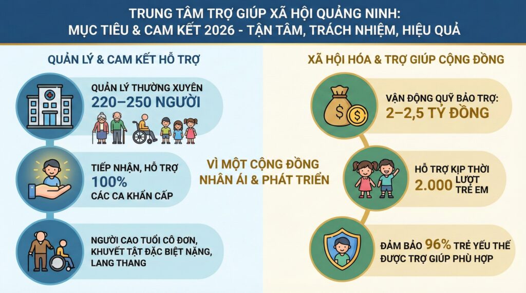 Bước sang năm 2026, Trung tâm Trợ giúp xã hội tỉnh Quảng Ninh xác định trọng tâm công tác là đổi mới toàn diện, nâng cao chất lượng dịch vụ và mở rộng các mô hình hỗ trợ tự nguyện nhằm đáp ứng tốt hơn nhu cầu của cộng đồng.